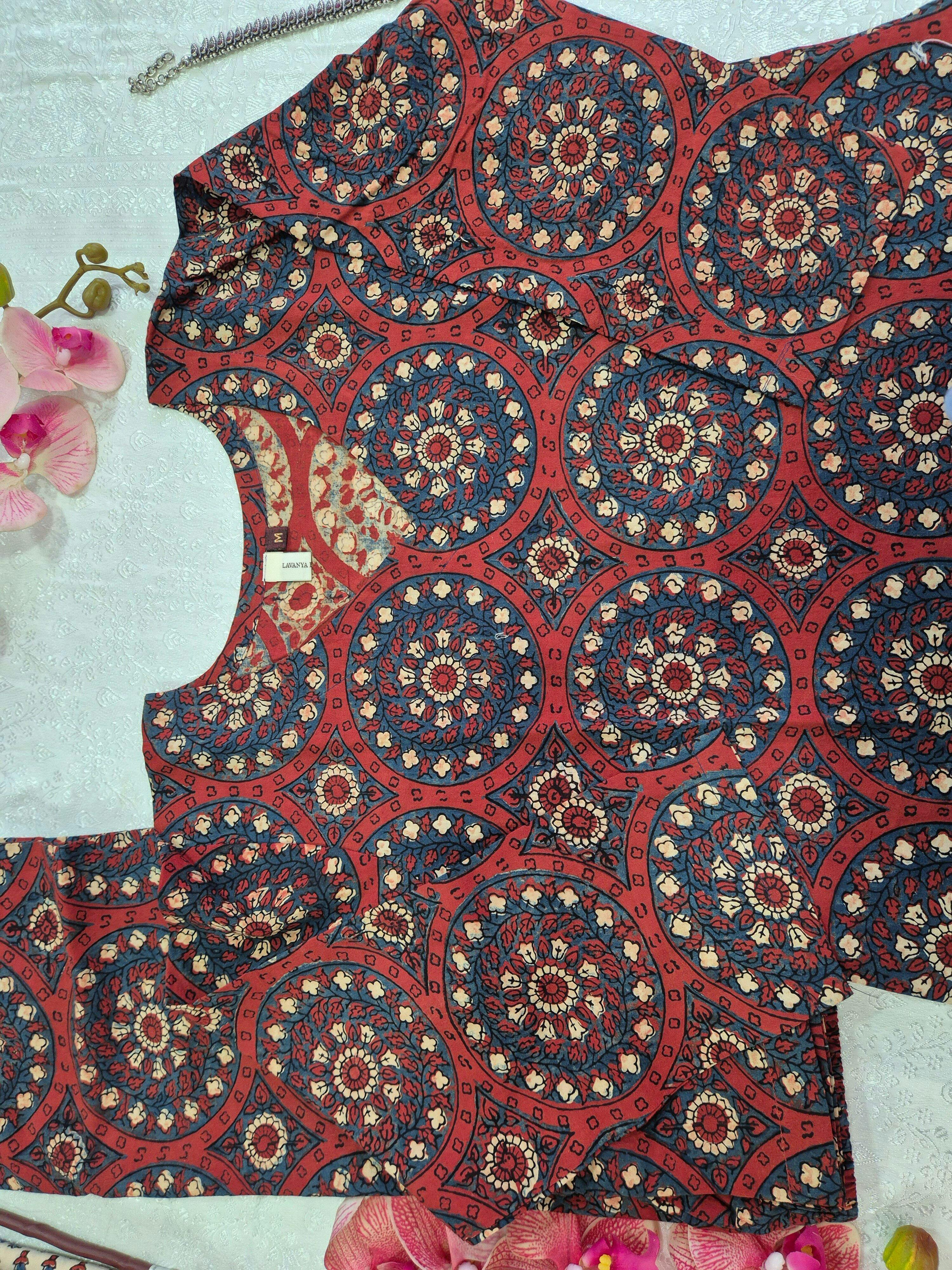 Features traditional Ajarak block-print patterns from Kutch, Gujarat with intricate geometric and floral designs.